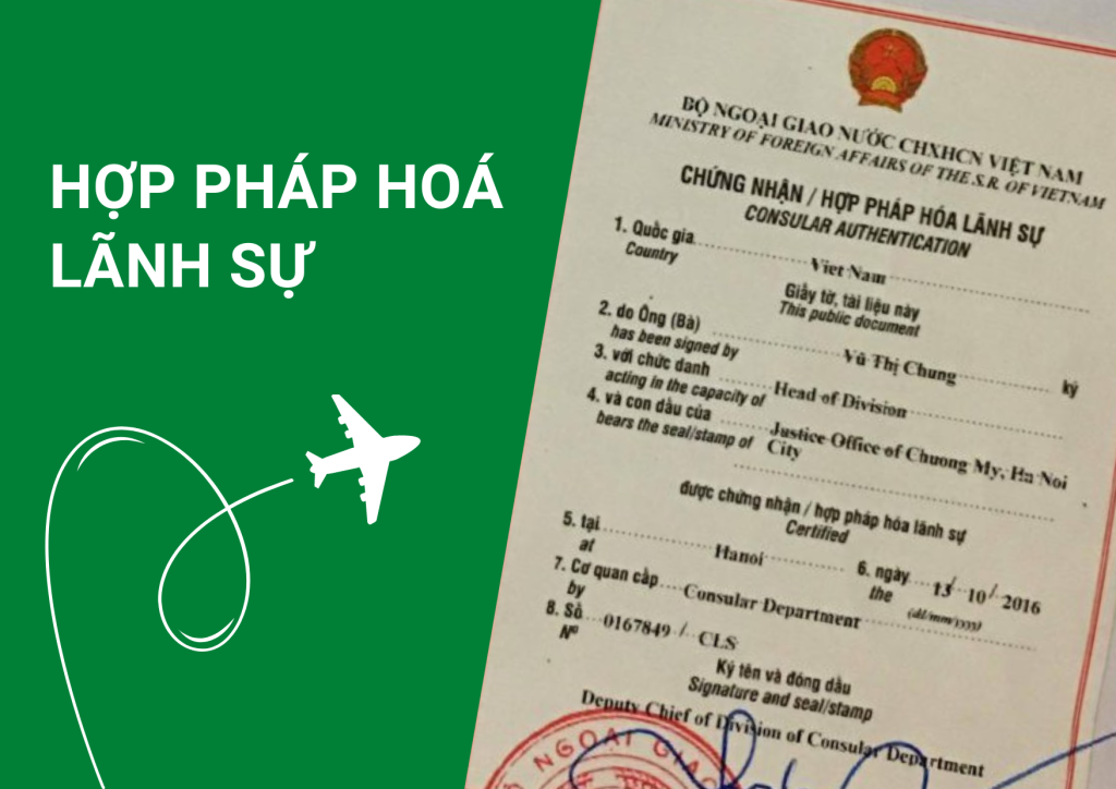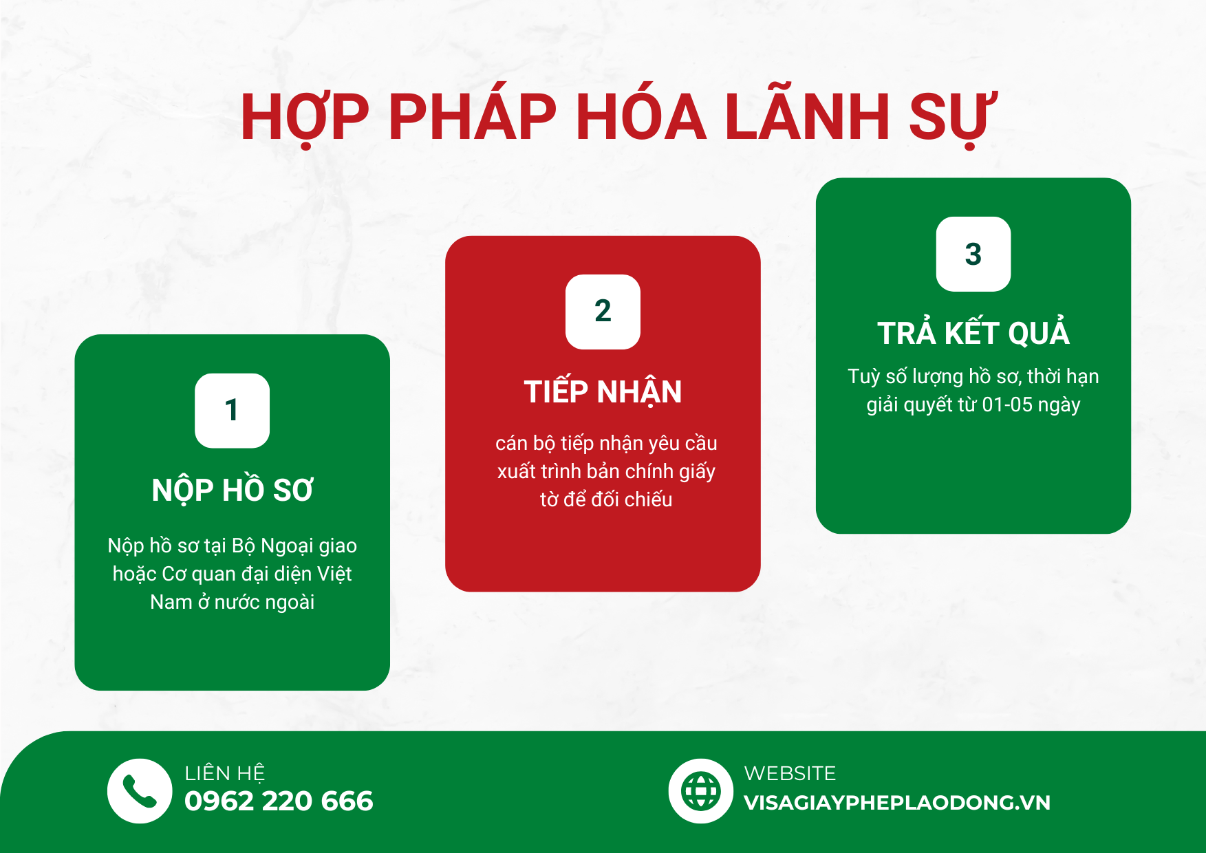 Sau khi nhận đủ hồ sơ, Bộ Ngoại giao hoặc Cơ quan đại diện Việt Nam ở nước ngoài thực hiện hợp pháp hóa lãnh sự cho hồ sơ này.